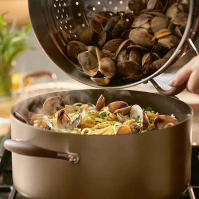 Aspiring home chefs, your first step to sublime cooking starts here. From dim sum to perfect pastas to lobster and clam boils, this versatile Anolon Advanced Home wide stockpot with steamer insert provides one of the very best nonsticks on the market. Step up to a carefully crafted kitchen essential designed to outperform, outlast, and outshine your current cookware. Engineered for fast, uniform heating, this hard-anodized pot is twice as hard as stainless steel for durability that lasts and comes with a steamer basket to steam, poach, and strain foods with convenience. Oven safe to 400°F, the stockpot features Infinity Slide technology for one of the longest lasting and smoothest-gliding cookware surfaces you can buy. If you expect more from your nonstick, welcome to the sublime cooking experience of Anolon Advanced Home.