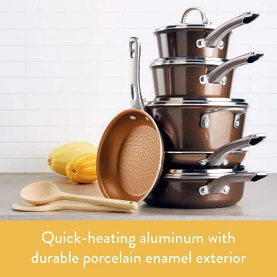 Cover the basics and unleash your kitchen passions with the Ayesha Home Collection 9.25-Inch Nonstick Frying Pan. The Ayesha Home Collection puts inspiring, high-quality cookware in easy reach for creating flawless traditional favorites, cooking fun and easy weeknight family dinners, or mastering signature recipes for brunches, date night, or a holiday get-together. The 9.25-inch nonstick skillet provides modern style in a fundamental size that’s perfectly suited to Ayesha’s Smoked Salmon Scramble or Honey-Pepper Shrimp. Constructed from fast- and even-heating aluminum with a stylish hard porcelain exterior, the frying pan features a sleek, flared silhouette for an accent of chic design to the kitchen. More than just a pretty pan, this high-quality nonstick skillet is oven safe to 500° F and features a double-riveted stainless steel handle for wielding maximum versatility in the kitchen to sear up a juicy Easy Pan Steak or caramelize yellow onions and mushrooms. Plus, an enhanced nonstick coating provides long-lasting, effortless food release and easy cleanup of even the gooiest recipes like Ayesha’s Bananas Foster. Sizzle up some creative kitchen cool and pull off simple and sophisticated recipes easily with the Ayesha Home Collection Porcelain Enamel 9.25-Inch Nonstick Frying Pan.