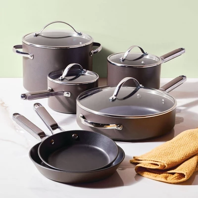 Designed for practical performance with a stylish touch, the Hard Anodized Collection from Ayesha Curry is effortless cookware for the everyday cook. Thick gauge, hard anodized aluminum pots and pans deliver fast, even heat and are extra durable for busy, modern kitchens. Featuring two saucepans, two frying pans, a stockpot, and a saute pan with lid and helper handle, this professional grade cookware set has a sleek, versatile design that pays special attention to the details that make cooking feel less like work. A triple-layer premium nonstick surface lets foods glide off the pan with ease, plus an extra nonstick exterior finish makes cleanup a breeze, and tempered glass lids let you watch meals while they cook. Sleek, stainless steel and silicone handles give a secure, comfortable hold, and because oven-to-table versatility and convenience is a must, this essential nonstick cookware set is oven safe to 400 degrees! Make some memories and bring the family together for great meals made easier with the Ayesha Curry 10-Piece Hard Anodized Nonstick Cookware Set.