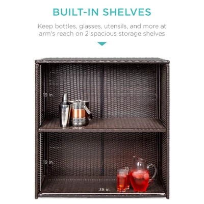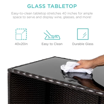 Entertain guests and unwind for the weekend with this stylish full bar set! Keep your favorite drinks and glasses conveniently at-hand with two spacious interior shelves and a large, easy to clean tabletop. Its weather-resistant wicker design and glass tabletop make it the perfect option for both indoor and outdoor use.