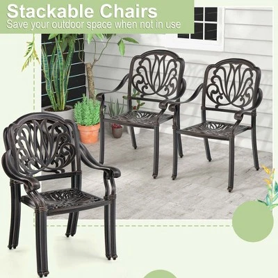 After simple assembly, these outdoor dining chairs are ready to use. The backrests, armrests and seats are all curved, making you feel more comfortable. What’s more, the rustproof and sturdy cast aluminum not only assures you higher durability but shows you 360 lbs strong bearing capacity. After using them, just stack these patio armchairs together for space-saving.