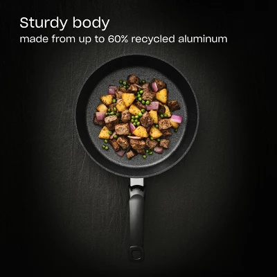 Adamant serving pans are suitable for any stovetop, including induction. Their exclusive CookStar base provides optimal heat absorption, distribution, and retention for even cooking and helps you save energy on any type of stovetop. Made from up to 60% recycled aluminum, the pans are durable and their highly scratch-resistant, nonstick coating makes them safe to use with metal kitchen utensils. The unique coating of silicon carbide particles creates a rugged, hard-as-stone surface with a texture reminiscent of cast iron cookware. You can heat, sear, saute, stir-fry, or pan-fry with ease and dish meals without the worry of ingredients sticking. The ergonomic safety handles with finger shields offer anti-slip, smooth handling, and heat protection. For easy measurements, an integrated laser-engraved scale in liters allows you to measure liquids while cooking. Every cook and kitchen should have one!