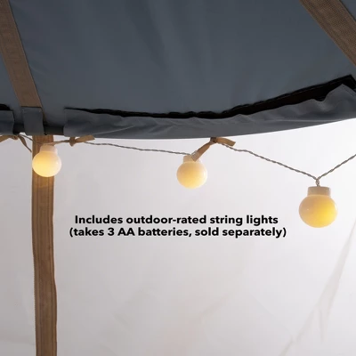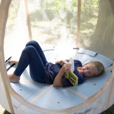 Welcome the Panorama HangOut to our HugglePod family! Structured with thick vertical webbing combined with a widened hanging point for added stability, this bell-shaped hanging tent/play space is well-balanced and easy to enter and exit. The HangOut top and bottom are stitched from sturdy Oxford cloth in natural shades that compliment nature, with breathable, outdoor-rated flexible mesh fabric sides and roll-up door. Kids (and grownups!) enjoy panoramic views from the inside, and parents can monitor play from the outside. The floor is grommeted for drainage. Outdoor string lights (with water-resistant battery box) add ambience on warm summer evenings; add cushions, toys and books for an especially cozy hideaway. Weight limit 350 lbs.; includes hanging hardware and ropes, and a carrying case for simple storage and portability. Lights require 3 AA batteries (not included).