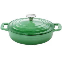 The MegaChef Round Enameled Cast Iron Casserole in Green, provides the ideal size and shape for a multitude of dishes. Its cast iron make allows for even and long lasting heat distribution for the evening supper. With an round shape, the braiser pan can accommodate larger cuts of meat; perfectly suitable for grand dinner parties. Cut down in oils and fats with the non-stick enamel coating, creating healthier daily meals! Create an array of dishes ranging from seasonal delicacies to common year round morsels for all to enjoy!