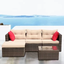 4pc Wicker Patio Sectional Seating Set With Cushions – Natural – GODEER