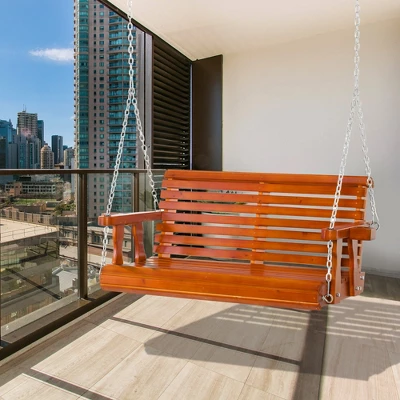 Enjoy the beautiful weather with friends and family when you relax on Outsunny swing chairs for outside. Have a seat and let the rocking motion sway you gently back and forth. Made of slatted fir wood, pre-painted with a water sealing paint that helps it drain away rain and stay dry. Enjoy a glass of lemonade with a friend, the swing bench seats two adults and has cup holders in the armrest so you can keep cool with a drink and swing through the breeze all summer long.