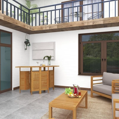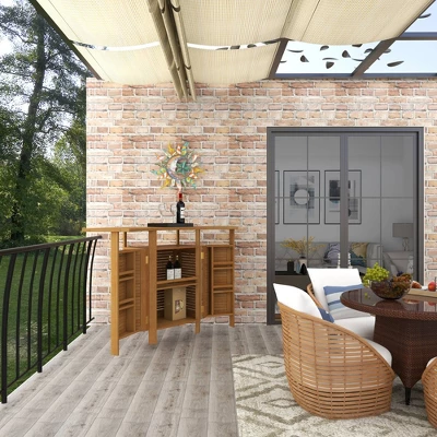 Make your friend thirsty with envy with this outdoor bar cart. Looks stylish in your living room or kitchen as a serving tray or as a decor stand. Use this table as the centerpiece to your home bar in your outdoor and garden setting. This accent furniture features a 2-door cabinet. This item ships in 1 carton. Item measures 37.625″L x 20.5″ W x 42.375″ H when closed.. Suitable for indoor use only. Maximum weight limit is 100 lbs. Made in Indonesia. This is a single bar. Traditional style. Teak wood naturally retains its oil, making it water-resistant and durable for long term use. We recommend to use clear teak oil with strong UV protection to ensure longevity. Brown bar can hold 3 average wine bottles.