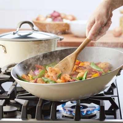 Level up your kitchen with Cook + Create Nonstick Cookware from Rachael Ray. This roomy 14-inch wok is crafted from thicker gauge aluminum for a luxe and sturdy feel and reliable stovetop performance that heats up quickly and evenly. The on-trend, contemporary design features bigger and wider cooking surfaces for optimum stir fry performance with flair. Want even more convenience? The wok also features two silicone grip side handles with nonstick on the inside rivets, for super-smooth stirring and easy-clean cooking surfaces that don’t get food build-up around the handle attachments. A new, triple layer nonstick provides the ultimate in scratch resistance and durability, and the stir frying wok pan is oven safe to 400°F. For even more of what you want (and less of what you don’t), reach for Rachael Ray Cook + Create cookware and uplevel your mealtime moments with performance and flair.