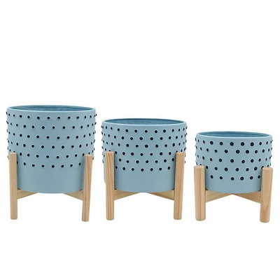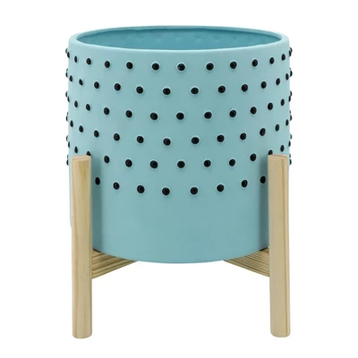 Sagebrook Home 10″ Wide With Wood Stand Dotted Ceramic Planter Pots