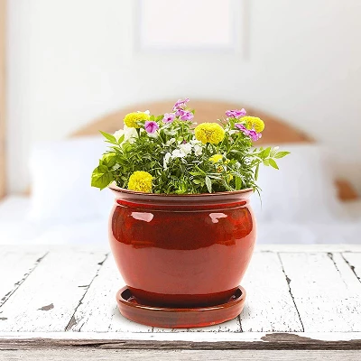 Provide your succulent, kitchen herbs, or a decorative flower with the perfect home thanks to the 2-Pack of Southern Patio 12-Inch Wisteria Ceramic Planter Pots with Saucers. These desktop planter pots are handcrafted from thick ceramic that’s light enough to easily move, but won’t tip over accidentally. The pot boasts a rolled lip and a fired oxblood red glazed finish for a classic profile and a dazzling look. The saucer base helps prevent spills and has a rubber bottom to keep your surfaces safe from scratches and scuffs. This patio outdoor flower urn can hold up to 30 quarts of potting soil, making it perfect for small and medium plants. The pot can be used both indoors and outdoors, giving your lawn, garden, office, or living room a splash of natural color. Get ready to bring out your green thumb and take your gardening time to the next level with the 2-Pack of Southern Patio 12-Inch Wisteria Ceramic Planter Pots with Saucers.