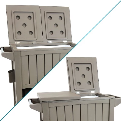 Add fun and function to the next outdoor gathering with this stylish patio cooler on wheels. This 3-in-1 rolling patio serving cart functions as a prep space, storage, and a cooler! This unique cart makes entertaining on your deck or patio a breeze with a variety of convenient food prep and serving features. The wheeled design makes it easy to move this cart from place to place. Plus, the external drainage tube makes cleanup easy. As an added bonus, built into the side of the cooler is a bottle opener to make opening beverages easier. This patio cart also features a variety of built-in storage options to keep utensils, condiments, and flatware neat and organized. The PVC bag cooler accommodates up to (80) 12-ounce cans and keeps them cool for up to 6 hours. This cart features a weather-resistant polypropylene and resin construction with a woodgrain design to add style and convenience to any outdoor living space.