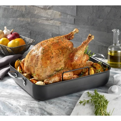 T-fal Ultimate Hard Anodized 16″x13″ Roaster ensures reliable results when preparing meals for the whole family that everyone will love. This versatile Roaster makes anything from juicy turkeys and tender roasts to savory lasagnas and sweet cakes. The even heat base provides fast heating for even cooking results. Dishwasher and oven safe up to 400°F; limited lifetime warranty.