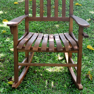 This rocking chair made out of Acacia Hardwood Natural Stain features classic style with slatted seat and back. The Rocker is suitable for indoor and outdoor use. Add your own decorative cushion and this piece is great for indoor use. Minimal assembly required; hardware and instructions are included.