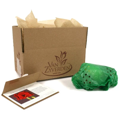 Hippeastrum (commonly known as Amaryllis) are popular for their indoor holiday color and are often given as gifts from October through January. They are easy to grow and are impressive flowers. Their large blossoms can measure up to 8″ across. We only ship one large blooming bulb size to ensure well-proportioned plants, which are guaranteed to produce large, vibrant blooms for you. As bulbs are essentially storage mechanisms, they already contain everything needed to produce flowers. They are tropical and subtropical. All you will need to do is plant them and water. But best of all, they can be induced to re-bloom indoors for years to come. If you want your Amaryllis to bloom in time for the holidays, it’s best to use this African grown variety as they are grown in the southern hemisphere, and thus take less time to bloom once potted (4-6 weeks). Huge blooms on stout, short stems. Two thick buds produced virtually at the same time. Some foliage with stems. Each bulb on average produces 1.8 stems, with an average of 6.8 blooms.